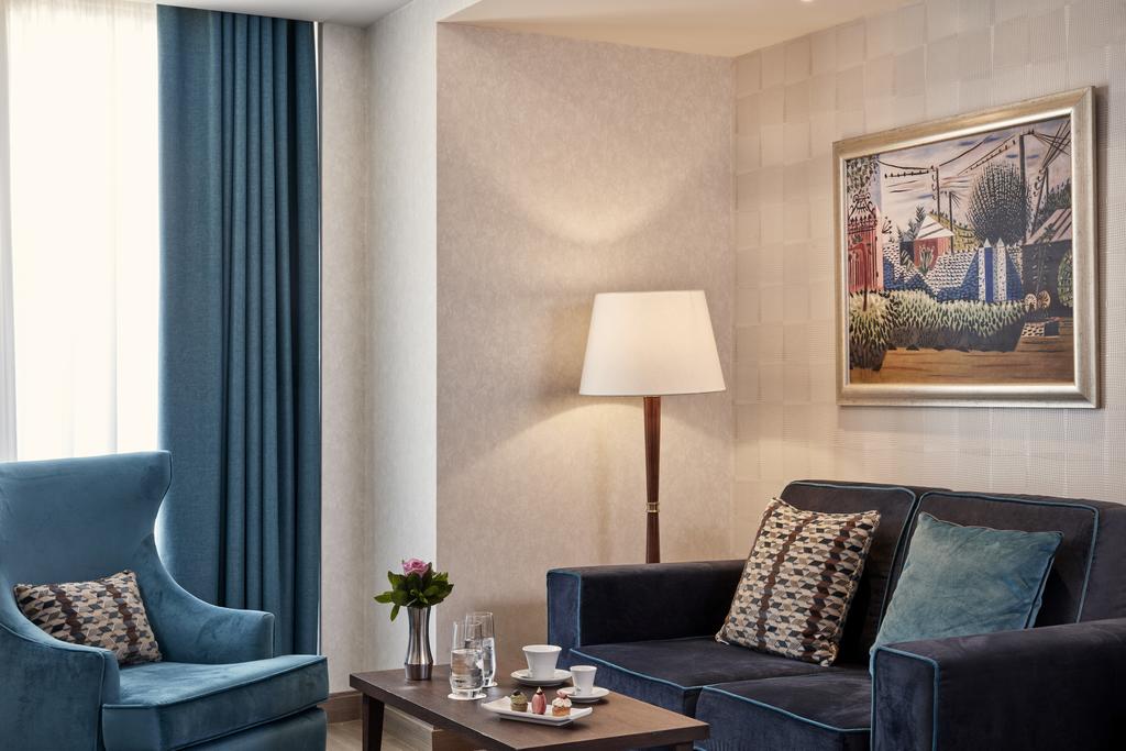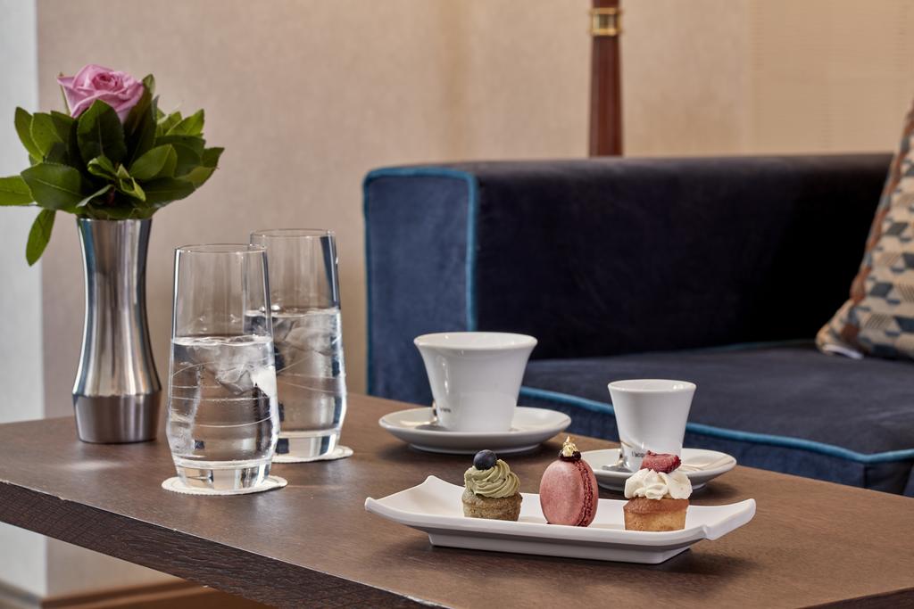 The retro-style lounge where guests can have a coffee or a drink is located in the center of the building in the atrium with unique skylights and decorated with Fassianos artwork. Guests can also taste Mediterranean flavors in the ground floor bistro with open kitchen.