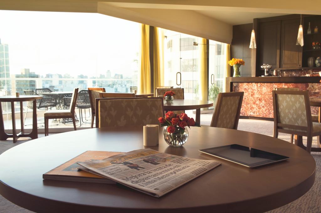 On the 11th floor, a sumptuous breakfast buffet is served while gazing out over the ocean and Lima city, as well as candlelit dinners, prepared with Peruvian products. Pisco Sour cocktails can be ordered at Belo Bar. Some guests will have access to the Executive Lounge which is located on the 10th floor. The lounge offers breakfast, tea, snacks, soft drinks and alcoholic beverages during the evening.
