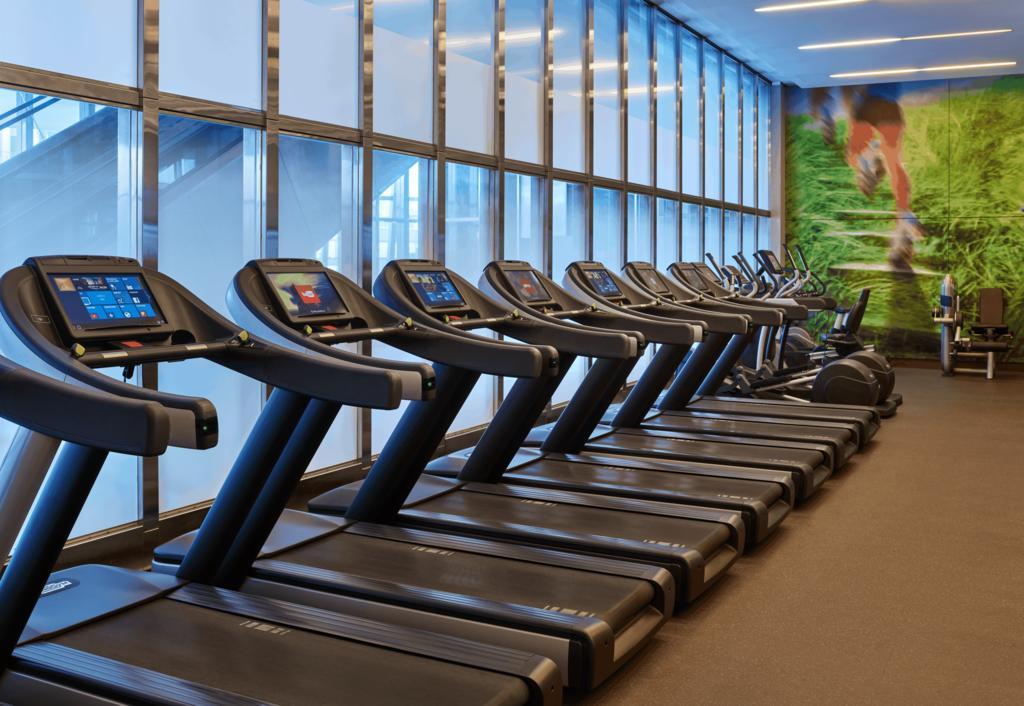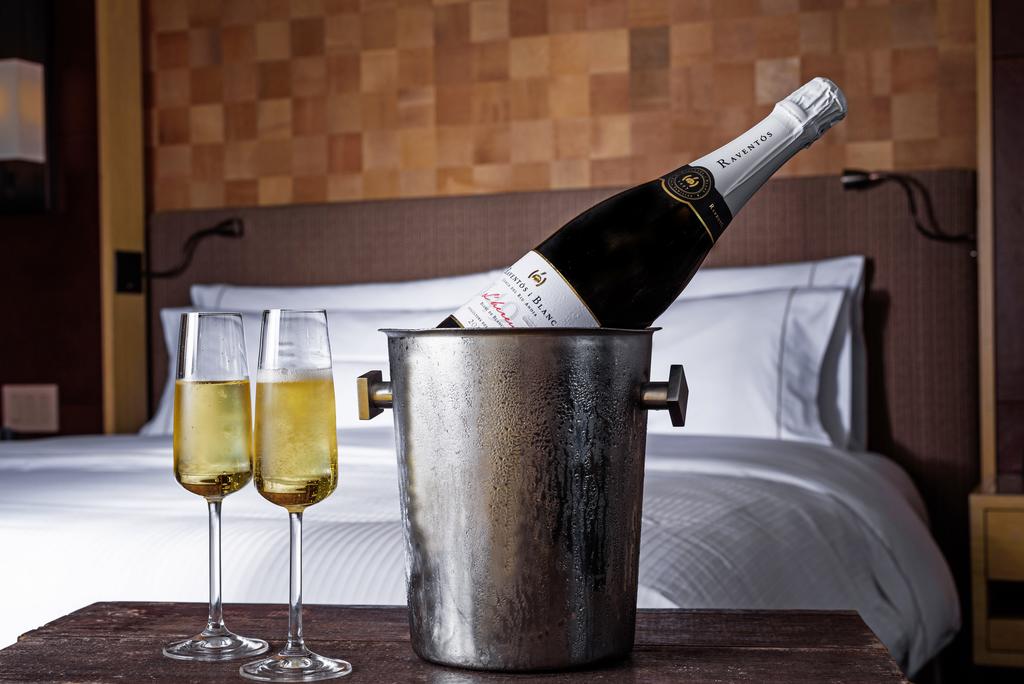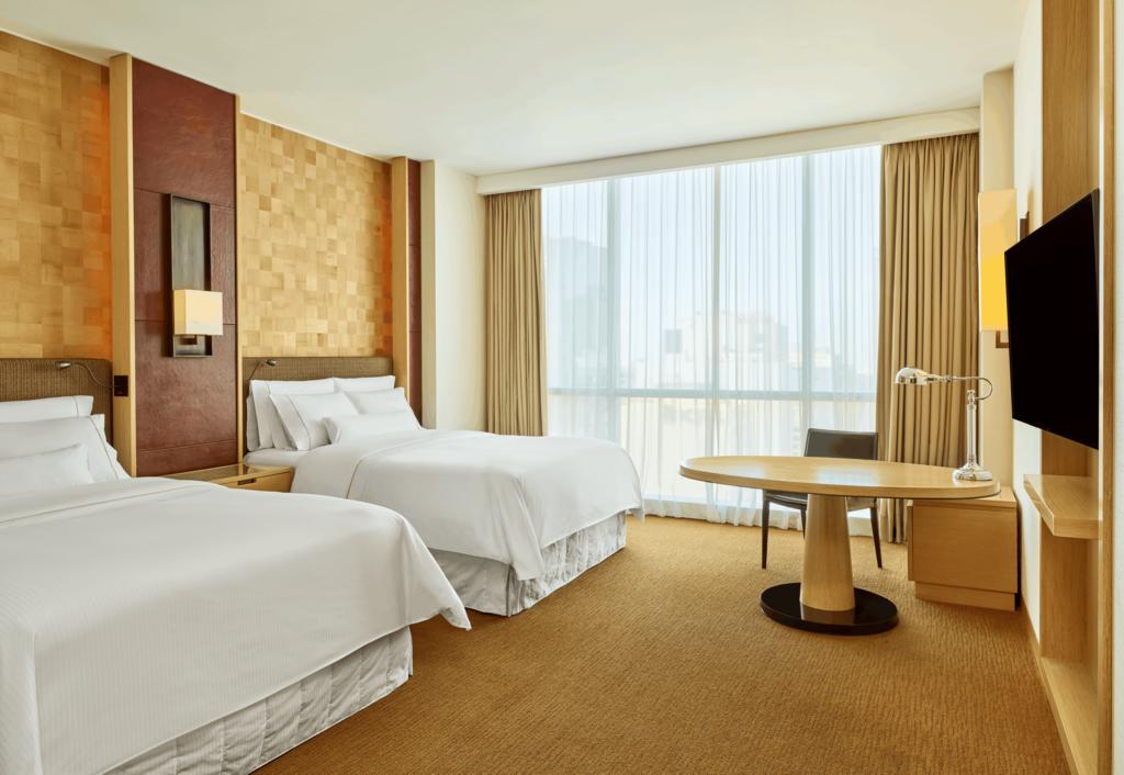 Rooms are fully carpeted and styled in tan and off-white hues. They have flat-screen satellite TVs, luxury Heavenly Bed linen with goose feather duvets, walk-in closets, and city views. All have minibars, in-room safe and coffee makers. All bathrooms have walk in shower separate from the tub. All rooms are non-smoking.